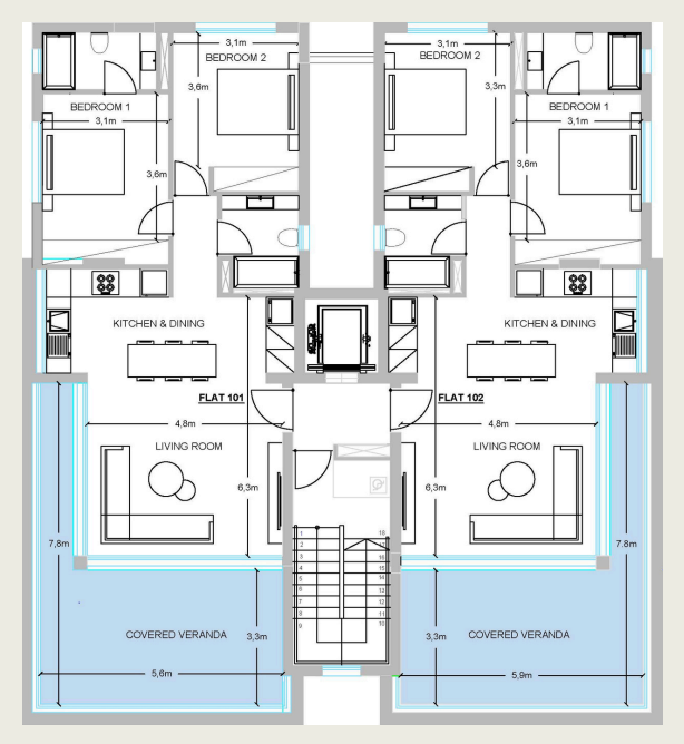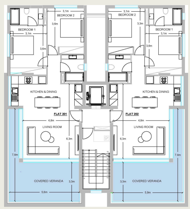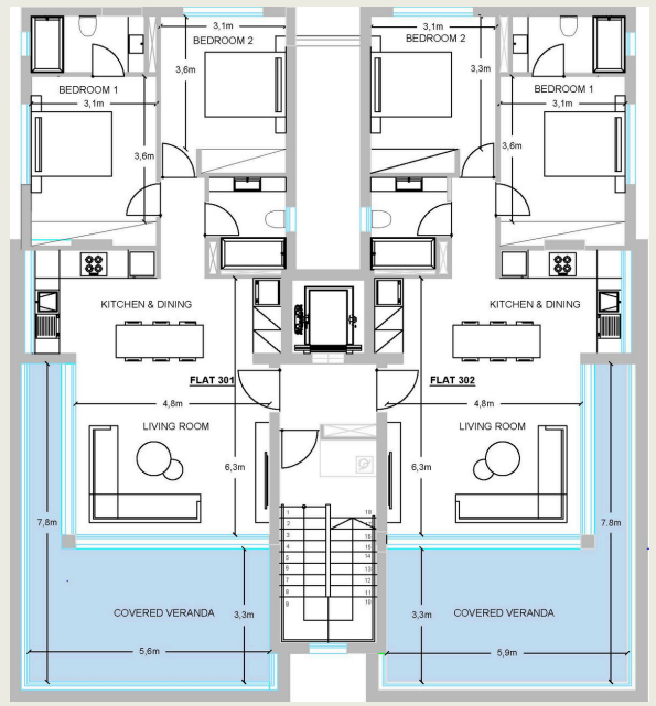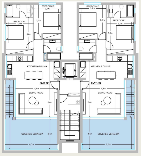 Each typical level features two symmetrically arranged apartments positioned around a central vertical circulation core, ensuring both privacy and intuitive movement. The open‑plan living, dining, and kitchen areas extend toward the façade, seamlessly connecting to deep covered balconies that function as natural extensions of the interior. Bedrooms are placed deeper within the layout to create a calm, secluded environment, while bathrooms and service areas are compactly organised for maximum efficiency.