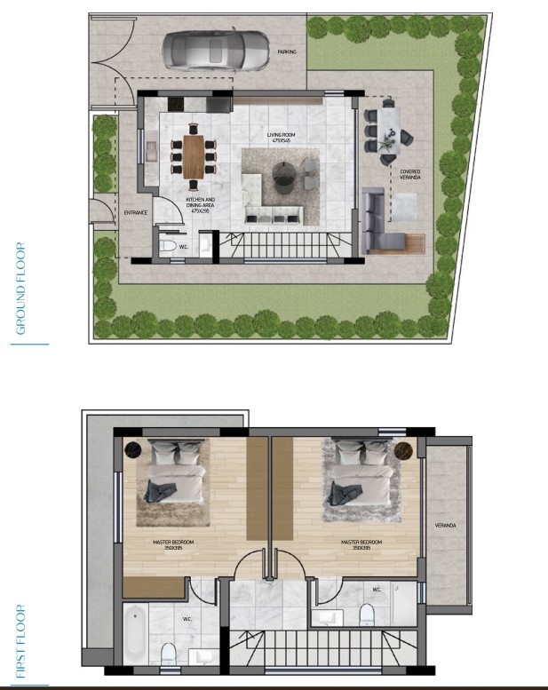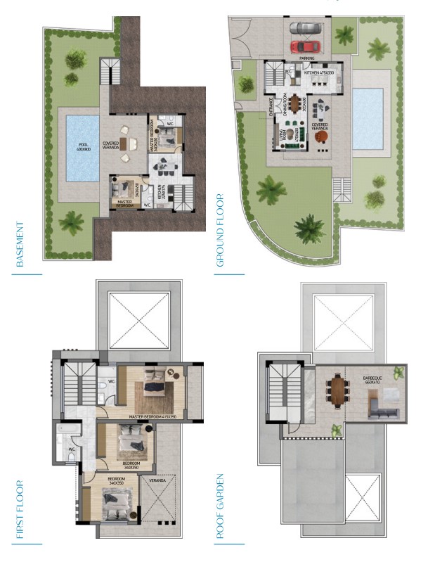 The stunning 5beds villas offer two master bedrooms with ensuites on the basement floor with a large veranda and access to the swimming pool, open plan kitchen and living spaces, guest wc on the ground floor and three more bedroom on the second floor, one with ensuite, an extra bathroom , the roof garden with barbeque area and dining al fresco enjoying stunning views of the surrounding areas.