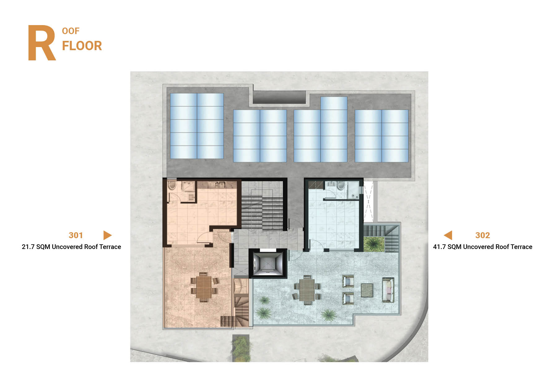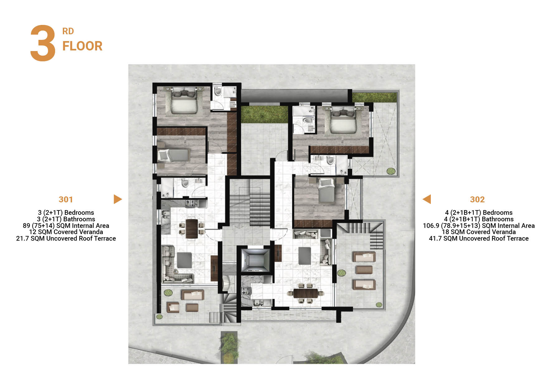 There are only two penthouses available for sale. 3 to 4 bedrooms, spacious living spaces , trendy kitchen, luxurious bedrooms and bathrooms, stunning penthouses with Roof Gardens, asking prices 400.000-465.000 euros plus vat.