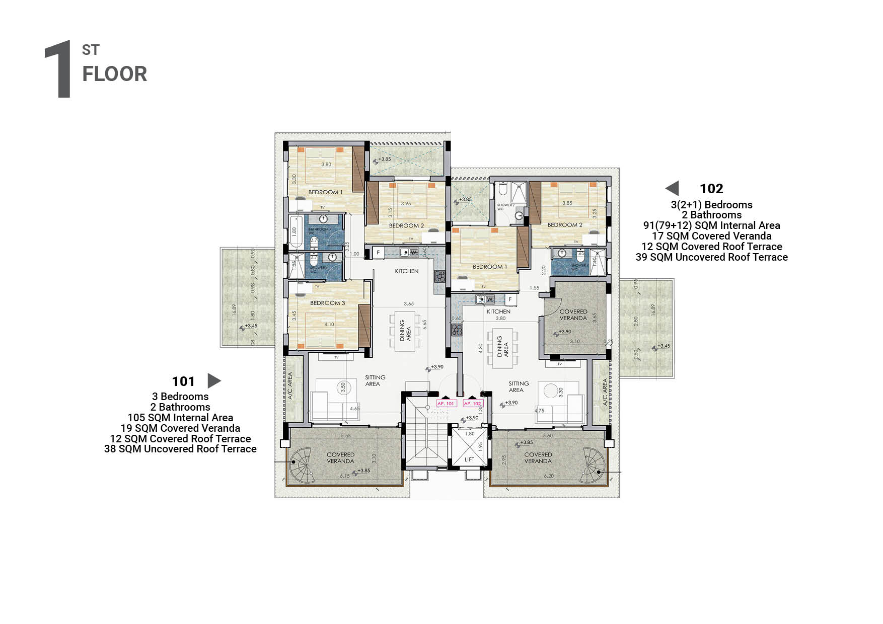 The project boasts a sleek and modern facade, with stylish architecture. Beautifully landscaped garden surround the building, maintained with beautiful flowers and lush greenery.. A covered parking space for the residents ensuring convenience and security. Spacious living and dining rooms in open plan arrangement,  with lots of natural light streaming through the windows. a modern kitchen ensures functionality and style while preparing your meals or entertaining, a quest wc, beautiful bedrooms with large wardrobes and bathrooms with modern fixtures and elegant finishes.