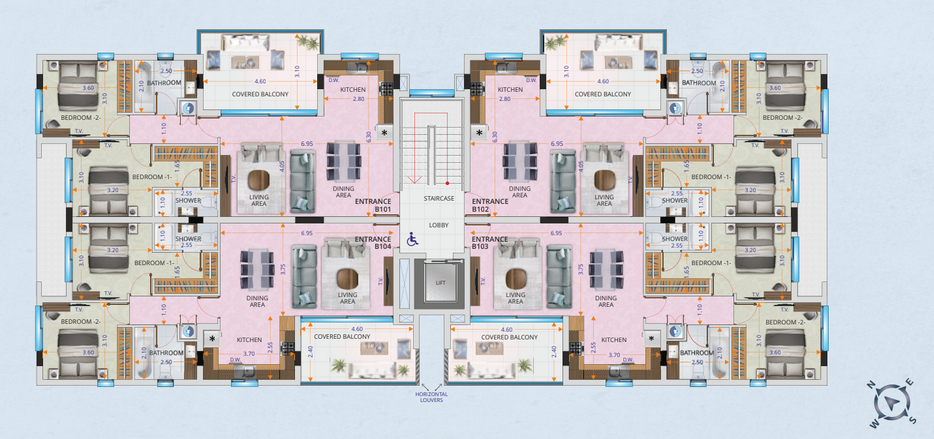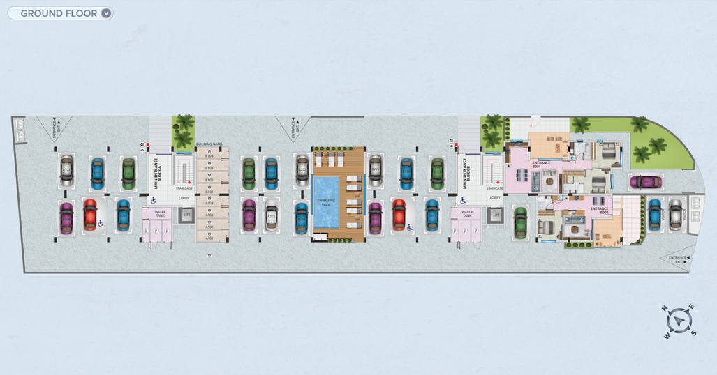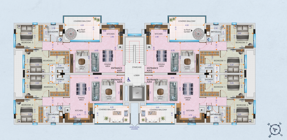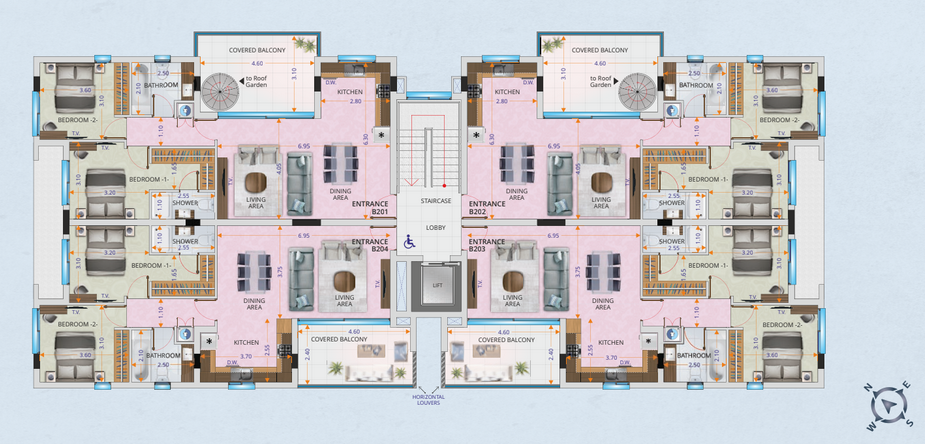 Select second-floor units enjoy private rooftop gardens with provisions for a jacuzzi and serene views over the peaceful residential neighborhood.