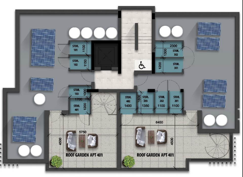 For entertainment and connectivity, residents benefit from a common antenna for Cypriot channels and a fiber optic internet connection. Eco-conscious features include provisions for electrical car charging, a photovoltaic system powering common areas, and dedicated photovoltaic systems for penthouses A401 and A402.