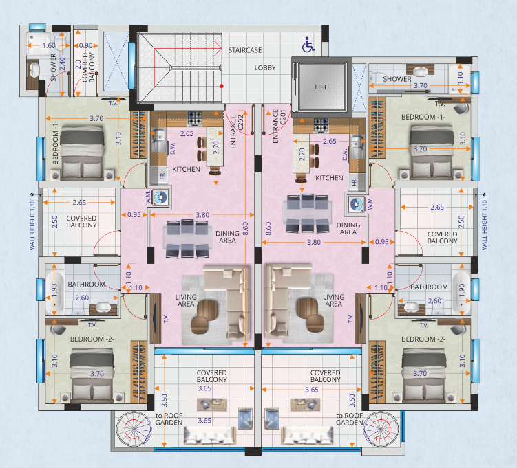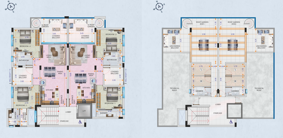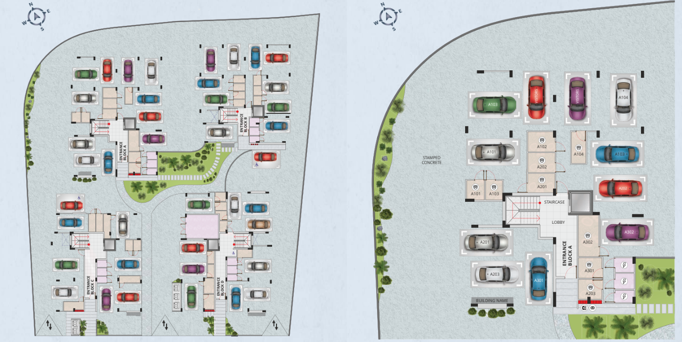 The two third-floor residences elevate the experience with private roof gardens, provision for a jacuzzi, and stunning neighborhood views. Every apartment includes a dedicated parking space and a storage room on the ground level.