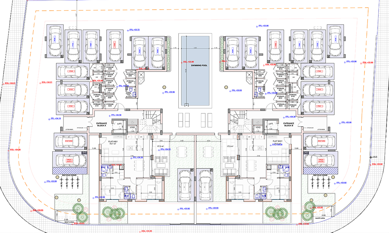An impressive residential complex is located into the most desirable location residential areas in Larnaka. Project consists of 2 separate blocks with luxurious and stylish apartments of 1 or 2 bedrooms. This beautiful complex has a communal swimming pool for the residents only. . It s located in a tranquil residential area surrounded by villas and houses right next to park. Sea is only 2klm away. Easy access to the highway, and short drive to all local amenities. A nice mixture of one to two bedrooms apartments , some with roof gardens.