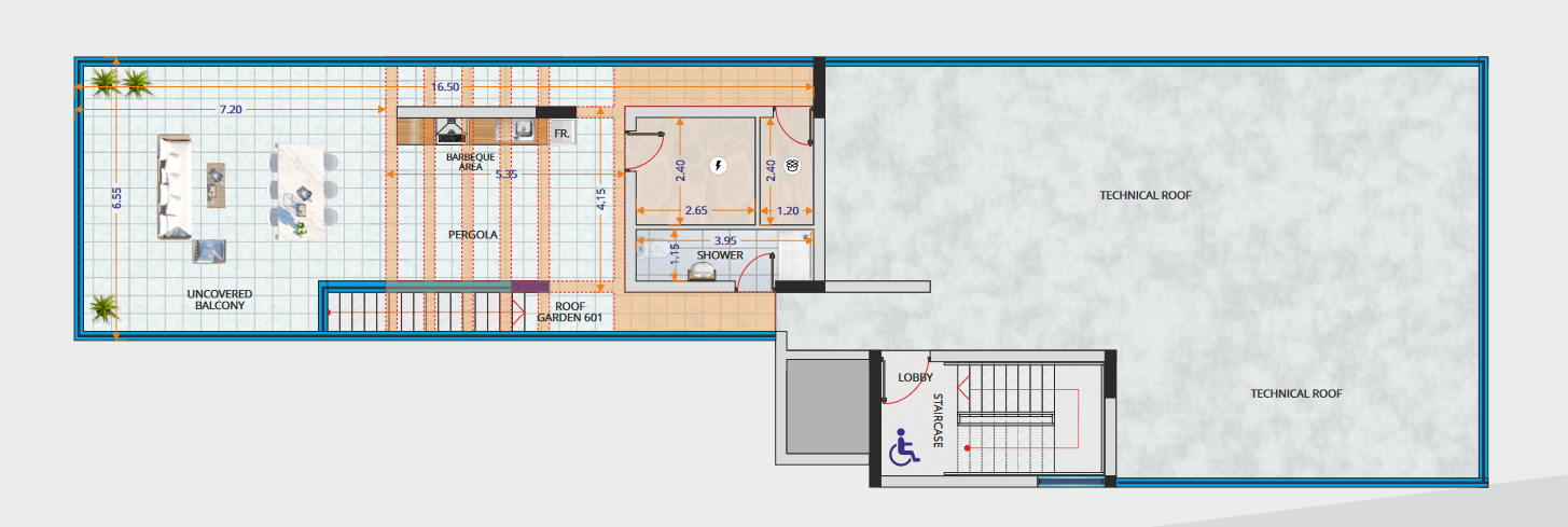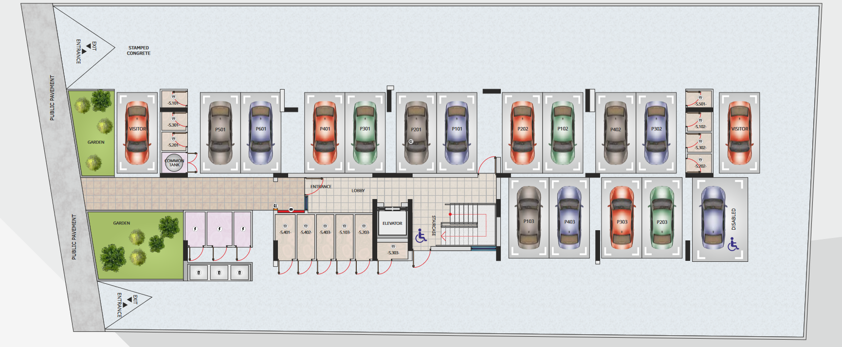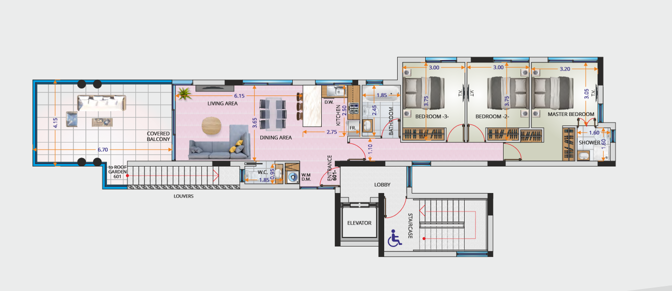 The project comprises of fourteen spacious apartments of three two bedroom and two bathroom from the first and forth post floor of the project. The fifth and sixth floor are whole floor apartments three bedrooms and three bathrooms each with lovely covered and uncovered balconies.