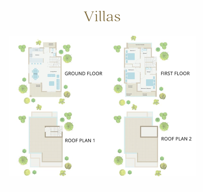 The open-plan layout seamlessly connects the living room, dining area, and kitchen, creating a sociable and inclusive space for family gatherings and entertaining guests. The kitchen is designed with high-quality materials and equipped with modern appliances, providing the perfect setting for culinary endeavors. Large windows and sliding doors allow ample natural light to flood the living spaces, creating a bright and airy ambiance. The three bedrooms are spacious and designed to offer privacy and comfort. The master bedroom features an en-suite bathroom. The remaining bedrooms are also well-appointed and share access to a separate bathroom. One of the highlights of these villas is the private pool, whether you want to cool off on a hot day or simply relax by the water, the pool provides a refreshing oasis for residents to enjoy. The surrounding pool deck offers ample space for lounging, sunbathing, and hosting outdoor gatherings. Some villas has roof garden which is another exceptional feature, providing a serene retreat and a picturesque view of the surroundings. The development also pays attention to the overall community ambiance, with beautifully landscaped gardens and pathways connecting the villas.