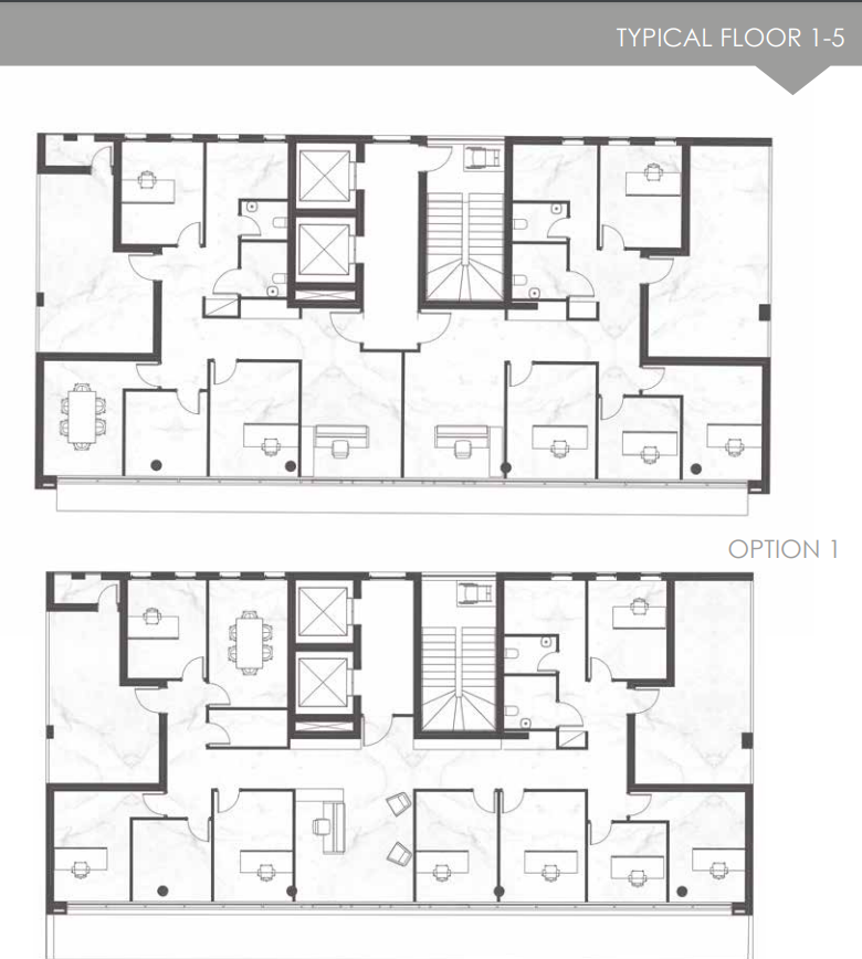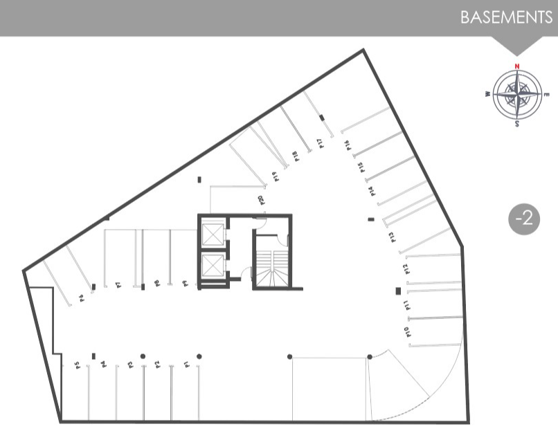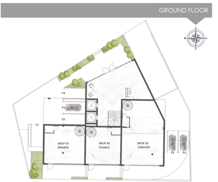 The building consists of five levels and two basements. On the ground floor we have designed three shops with mezzanine. The rest of the building, with separate entrance, lobby area and elevator, consists of five floors with comfortable office spaces which can be divided according to the space needed by each business, 42 parking spaces